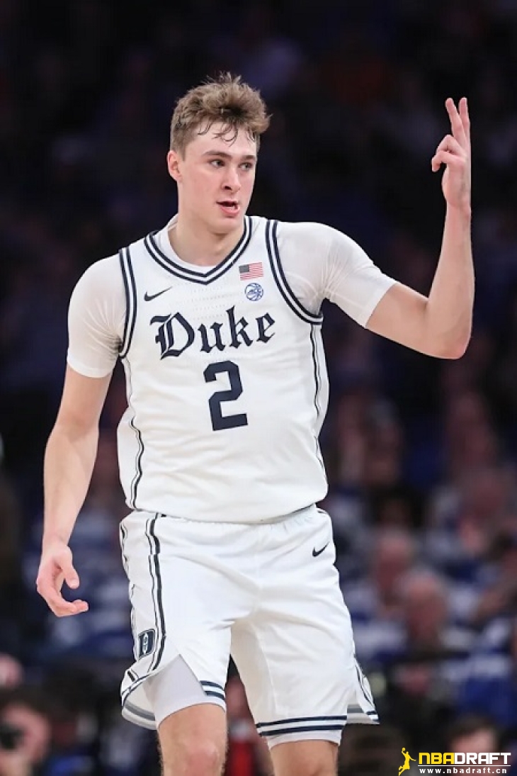 弗拉格的最与众不同之处,在于他精英级别的防守多样性。在防守端,他具备护框的身高、对抗和判断力,他也有外线换防所需的速度和敏捷性,同时防守态度始终积极、持续性极强。进攻端,虽然他还称不上完全成熟的终结者,但在杜克的表现已经足够出色,特别是在关键时刻多次承担起进攻重任,展现出了日益增强的统治力。他的赛场表现非常全面:能投、能传、能防,攻防两端都有巨大的潜力——这也是他毫无悬念地成为了2025年状元大热门的原因。不过,想达到预期高度,弗拉格还需要在进攻细节上持续打磨。