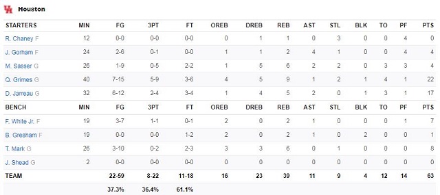 北京时间3月22日,在今天进行的NCAA锦标赛32进16的淘汰塞中,中西区2号种子休斯顿大学以63-60险胜罗格斯大学,惊险晋级,这也是休斯顿大学连续第2年进入甜蜜16强。
