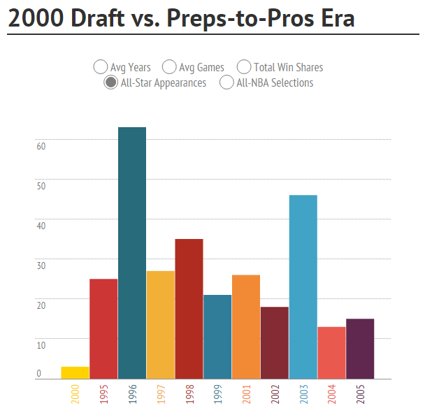 - 从1995年NBA允许高中生参选到2005年这一条款被废除,没有任何一届新秀比2000届新秀有着更差的产出: