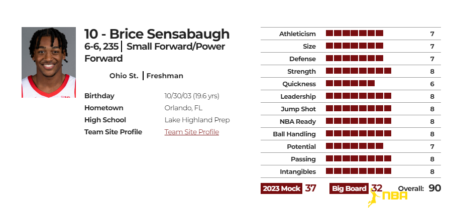 在2022-23赛季开始之前,森萨博还没能进入多家美媒的模拟选秀名单。但在大一赛季的出色表现加持下,森萨博甚至还冲到了首轮,19岁的他有着丰富的得分手段,在进攻端依旧有潜力可挖。当然,我们不能忽视森萨博在防守端的糟糕表现。在进入NBA之后,他需要在防守端得到正确的引导,来提升自己在这一端的表现。