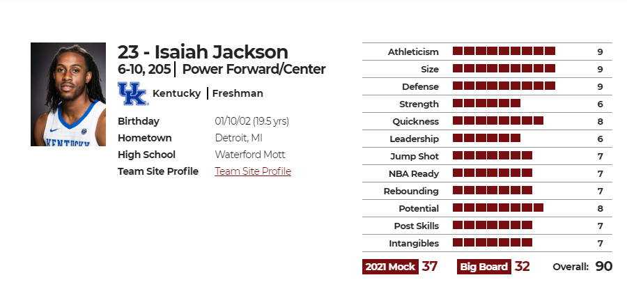 以赛亚-杰克逊是一名大面积防守者,是一名野兽型内线,能跑能跳,若他能够提升自己在防守端的纪律性和意识,有望成为一名防守大闸。